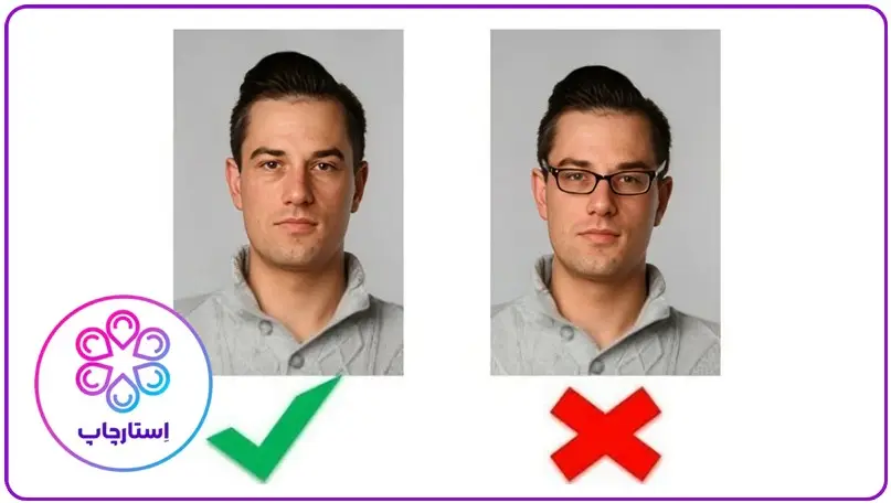 - استفاده از عینک در عکس تنها در شرایط خاص پزشکی مجاز است و در این صورت، باید مطمئن شوید که قاب عینک، چشمها را نپوشاند.