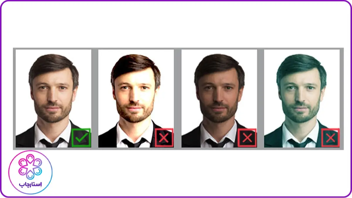 - ثبت تصویر به صورت پرتره مهمترین نکته است، به طوری که فرد مستقیما به دوربین نگاه کند و چهرهای خنثی و بدون لبخند داشته باشد.