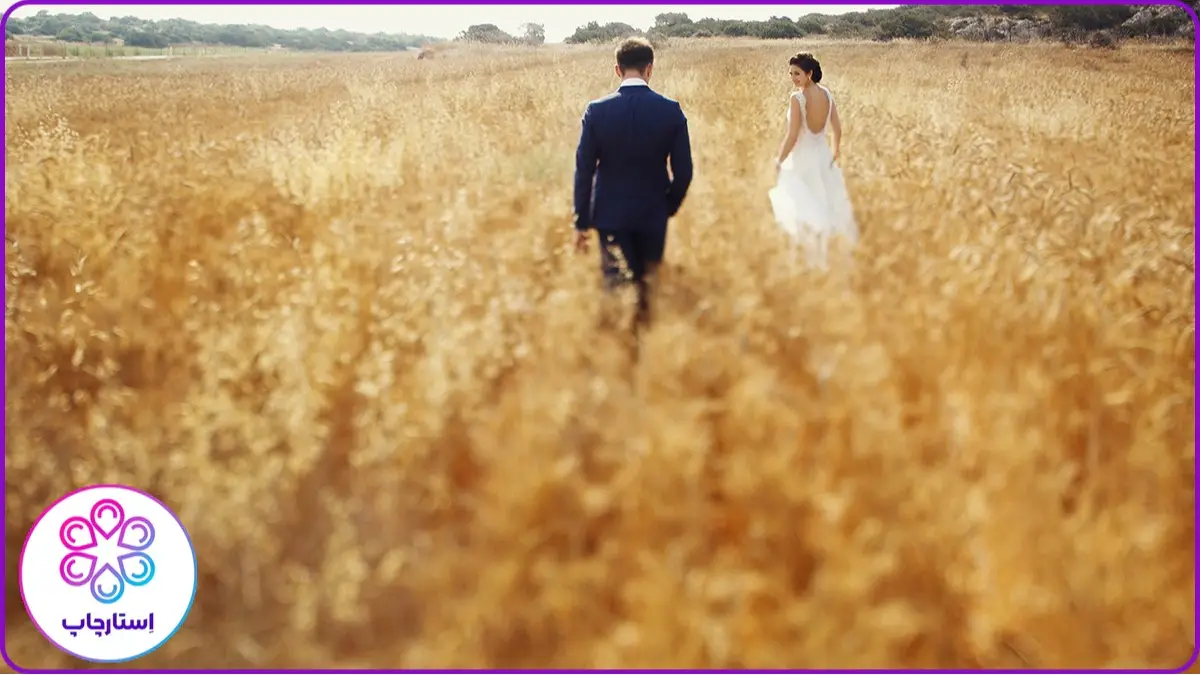1- ایده های عکاسی عروس و داماد از پشت سر وسط گندم زار